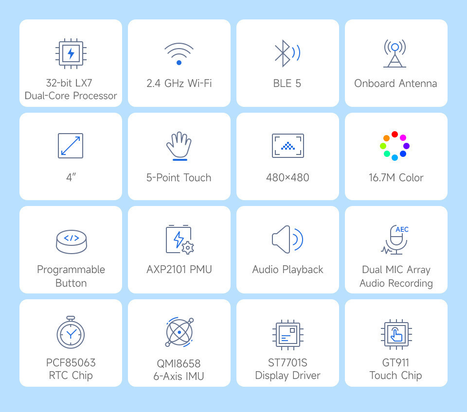 Integra una pantalla táctil capacitiva IPS de 4 pulgadas con resolución de 480 × 480 píxeles, colores vivos de 65K, ángulo de visión de 160° y soporte de 5 puntos táctiles, lo que permite una interacción fluida con interfaces gráficas avanzadas como LVGL.