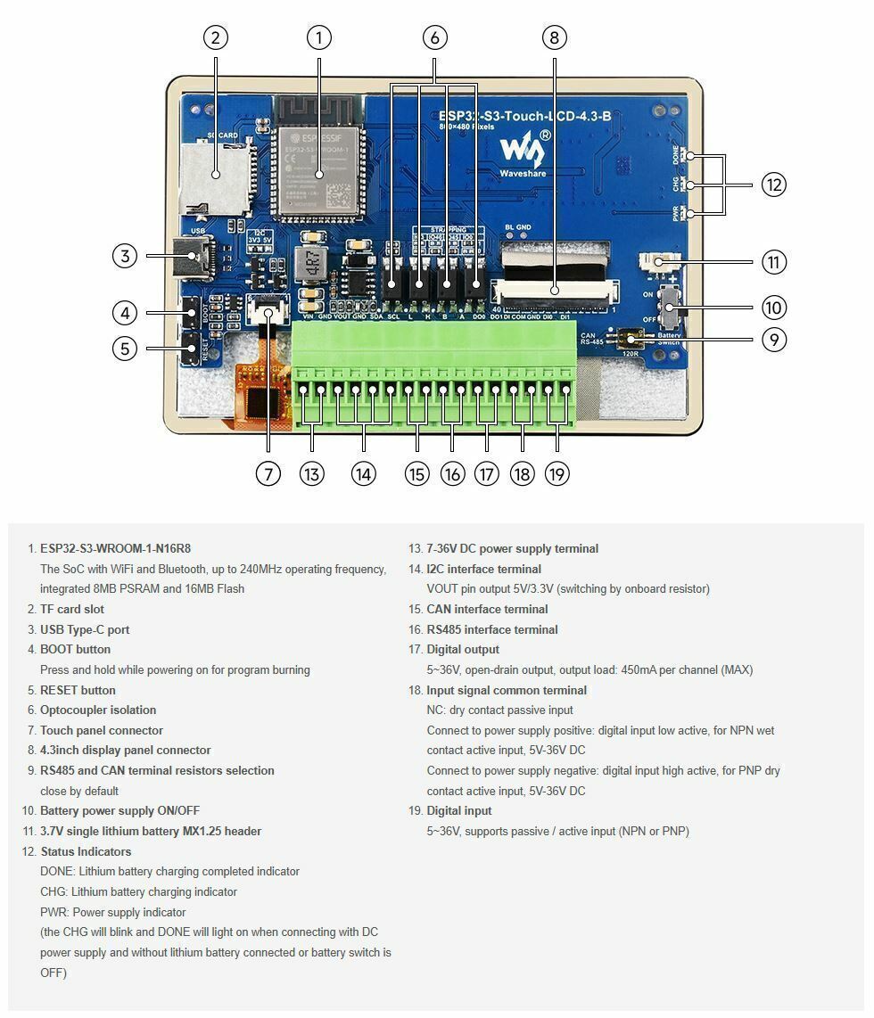 El ESP32-S3-Touch-LCD-4.3B es una placa de desarrollo con microcontrolador que incorpora conectividad Wi-Fi de 2.4GHz y Bluetooth 5 (BLE), así como memoria Flash y PSRAM de alta capacidad. La pantalla táctil capacitiva integrada de 4.3 pulgadas permite ejecutar fluidamente interfaces gráficas como LVGL. Posee múltiples interfaces periféricas, ideal para el desarrollo ágil de interfaces hombre-máquina (HMI) y otras aplicaciones basadas en ESP32-S3.